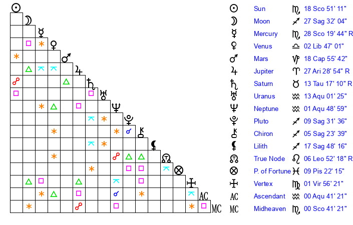 | Mercury | 28 Scorpio 19 | 6 Sagittarius 34 | 25 Scorpio 32 |