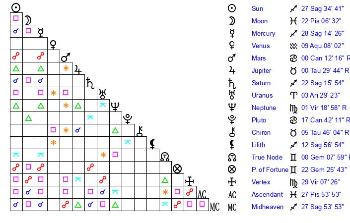 | Moon | 22 Pisces 8 | 24 Sagittarius 4 | 22 Libra 3 |