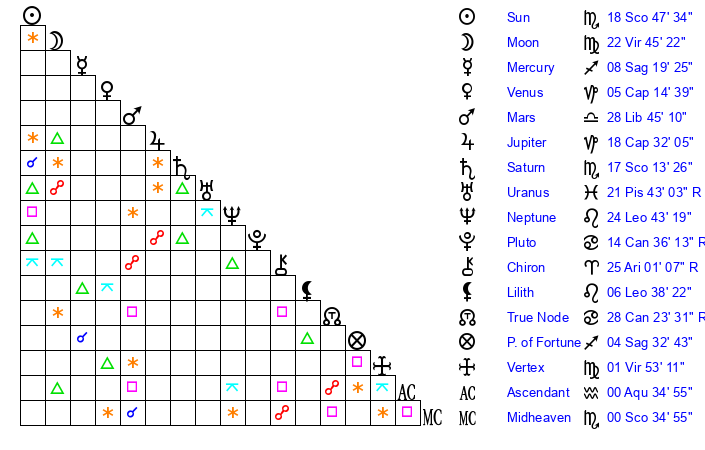 | Sun | 18 Scorpio 48 | 19 Scorpio 33 | 0 Pisces 19 |
