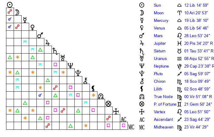 | Moon | 10 Aries 16 | 22 Pisces 50 | 3 Aries 30 |