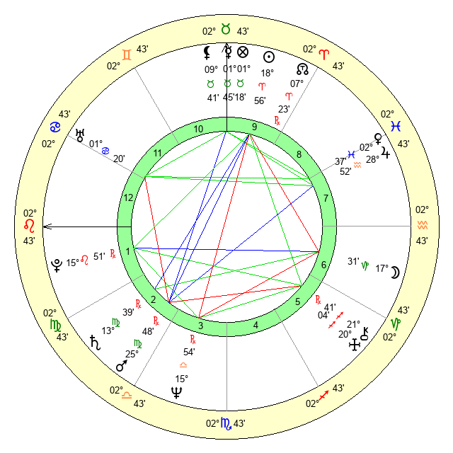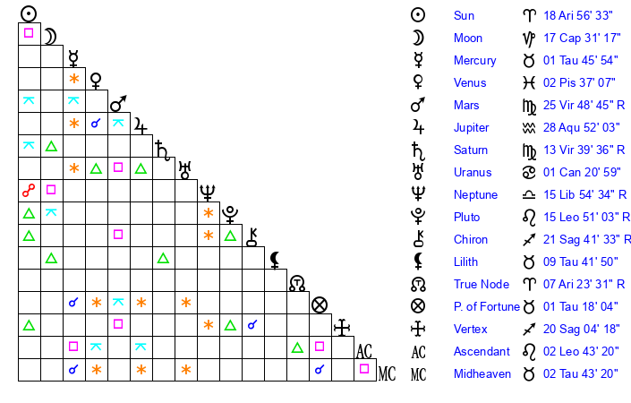 | Moon | 17 Capricorn 33 | 9 Virgo 46 | 3 Libra 22 |
