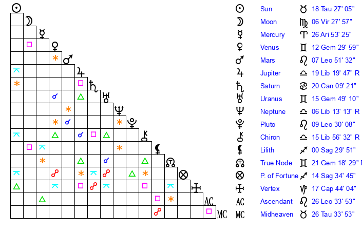| Sun | 18 Taurus 27 | 19 Taurus 19 | 4 Leo 2 |