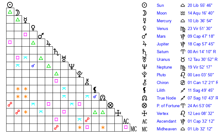 | Neptune | 19 Virgo 52 | 0 Aries 10 | 21 Virgo 3 |