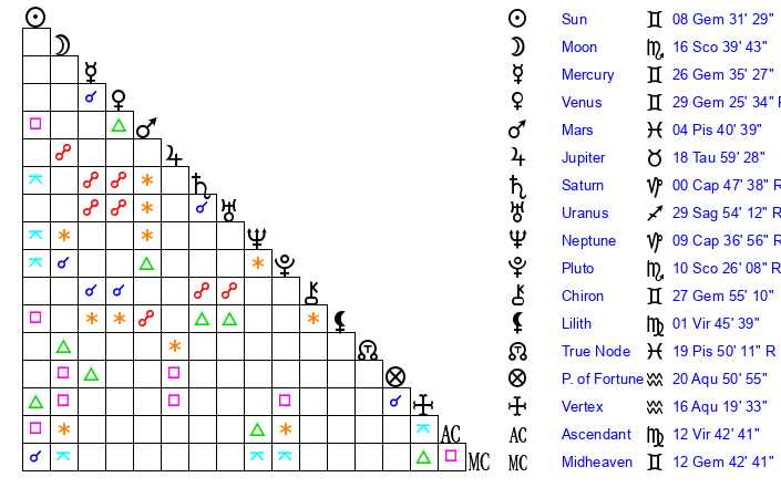 Venus | 29 Gemini 25 | 22 Aries 45 | 13 Gemini 57 |