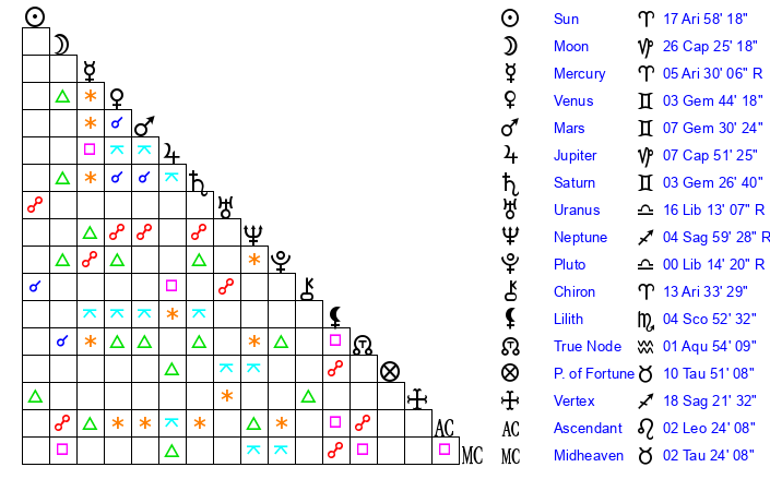 Moon | 26 Capricorn 17 | 19 Leo 20 | 7 Capricorn 37 |