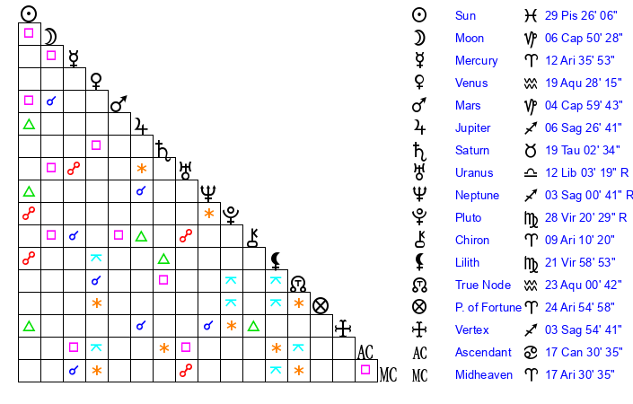 Sun | 29 Pisces 26 | 0 Aries 20 | 22 Taurus 16 |