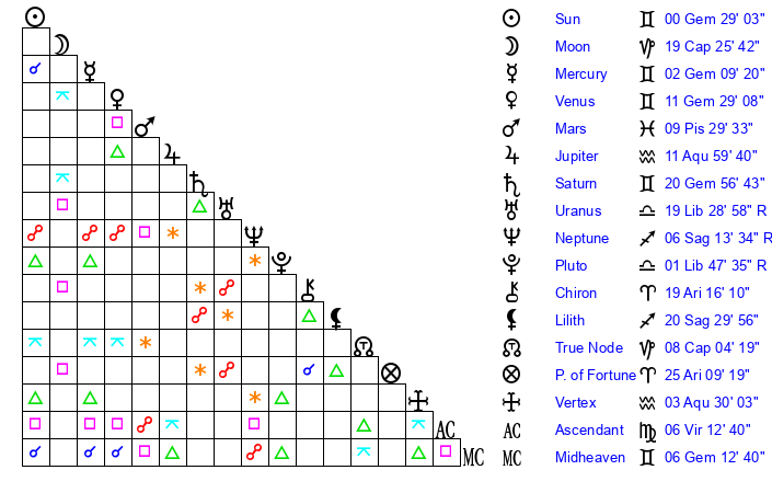 Saturn | 21 Gemini 13 | 29 Pisces 38 | 27 Gemini 54 |