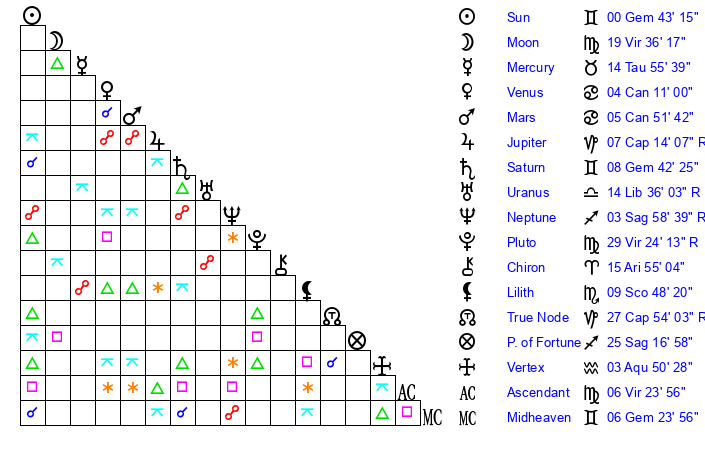 Sun | 0 Gemini 43 | 0 Gemini 53 | 21 Cancer 22 |