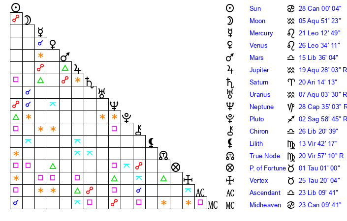 Moon | 5 Aquarius 45 | 3 Gemini 54 | 14 Aquarius 11 |