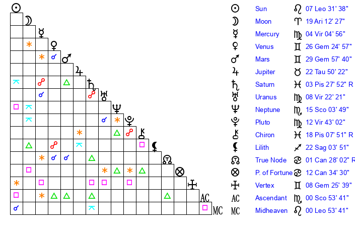 Moon | 19 Aries 6 | 17 Libra 55 | 20 Cancer 36 |
