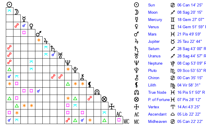 Moon | 8 Sagittarius 17 | 6 Leo 16 | 27 Aries 59 |