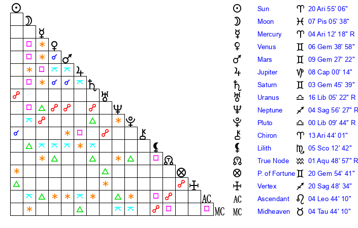 Sun | 20 Aries 55 | 21 Aries 4 | 12 Gemini 14 |