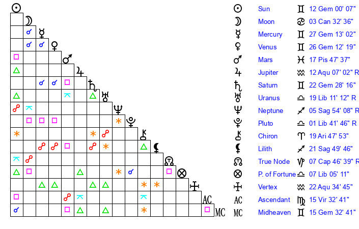 Mercury | 27 Gemini 13 | 16 Gemini 47 | 24 Cancer 36 |