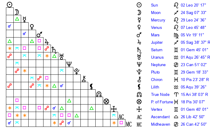 Venus | 7 Leo 46 | 23 Gemini 43 | 26 Sagittarius 57 |