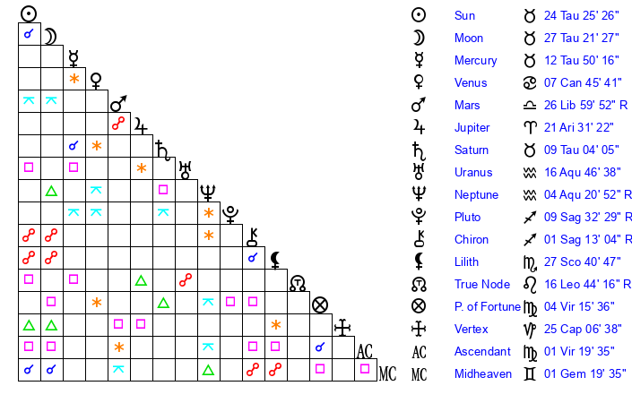 | Sun | 24 Taurus 25 | 25 Taurus 7 | 19 Gemini 23 |
