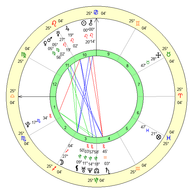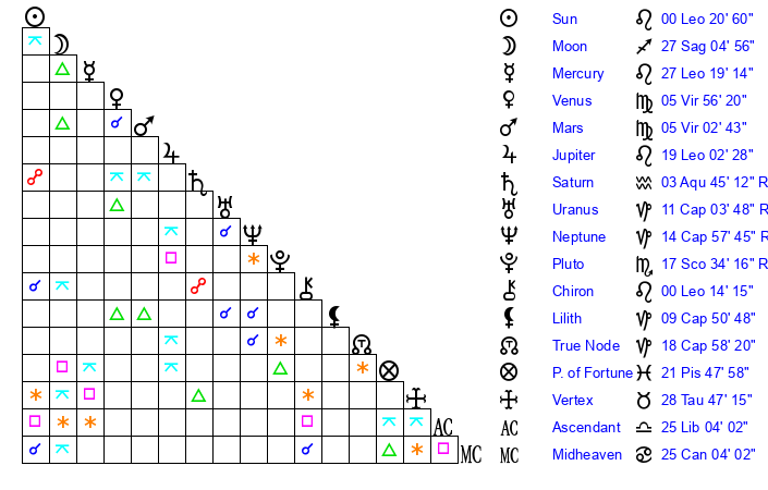 | Venus | 5 Virgo 55 | 21 Gemini 25 | 26 Leo 51 |