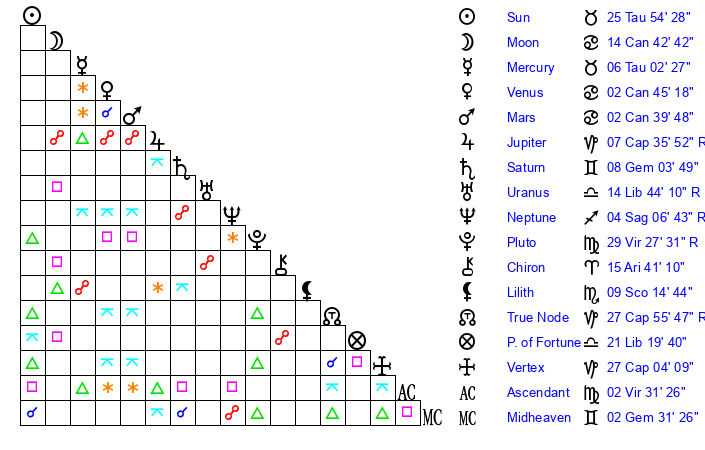 Moon | 14 Cancer 43 | 10 Capricorn 50 | 18 Gemini 7 |