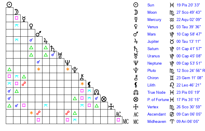 Moon | 27 Scorpio 46 | 26 Cancer 47 | 15 Aries 21 |