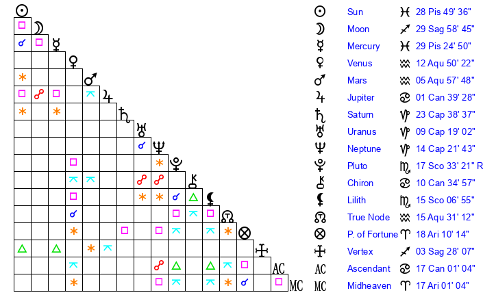 Moon | 29 Sagittarius 49 | 28 Scorpio 12 | 12 Aries 22 |