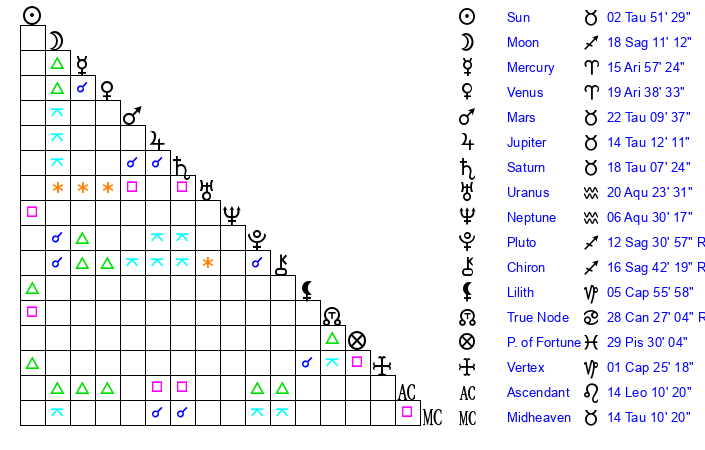 | Moon | 18 Sagittarius 6 | 22 Aquarius 59 | 20 Scorpio 3 |