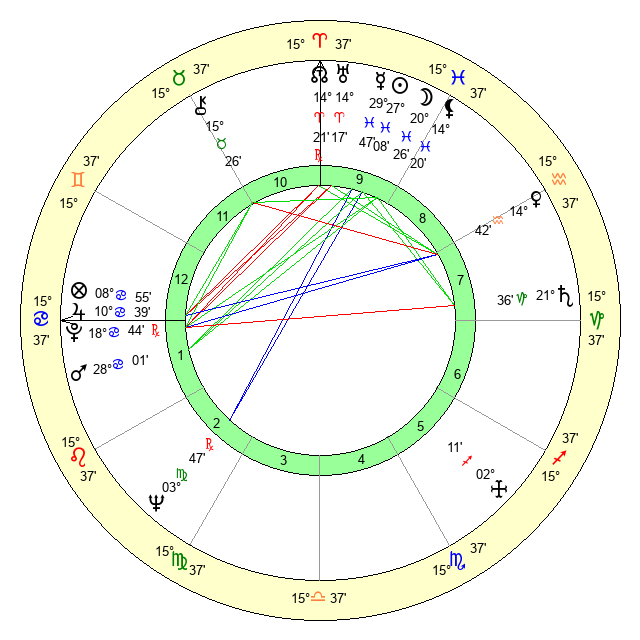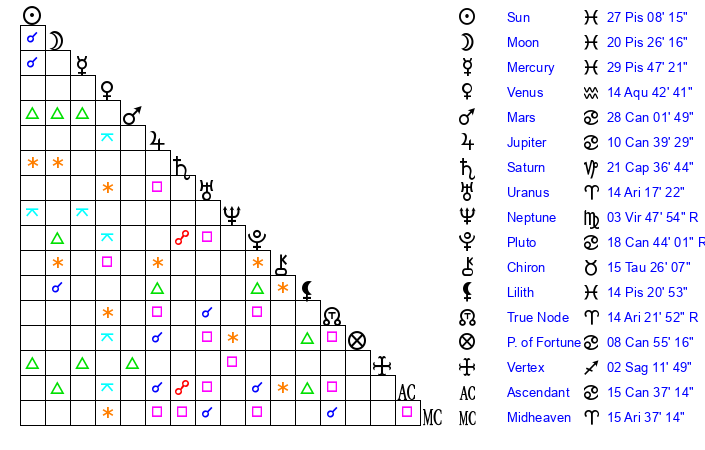 | Moon | 20 Pisces 25 | 16 Scorpio 22 | 27 Leo 57 |