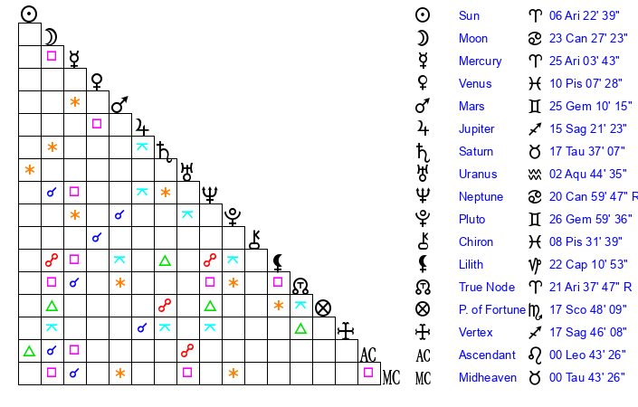 | Saturn | 18 Taurus 12 | 23 Pisces 51 | 1 Gemini 42 |