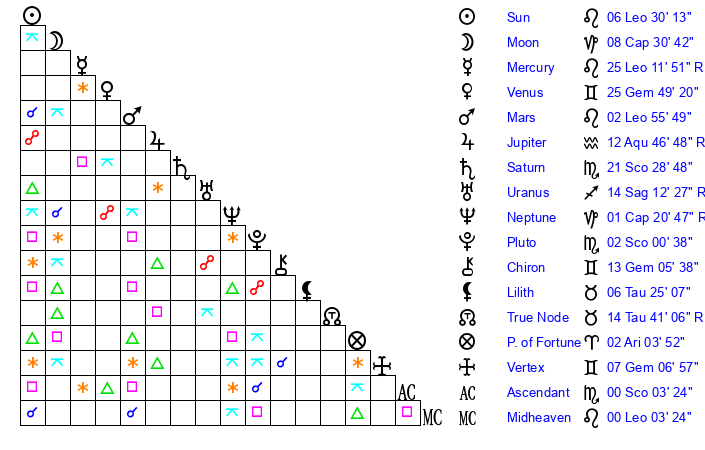 | Moon | 8 Capricorn 27 | 5 Libra 49 | 17 Gemini 5 |