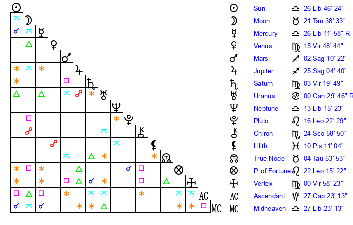 Sun | 26 Libra 47 | 27 Libra 22 | 13 Capricorn 35 |