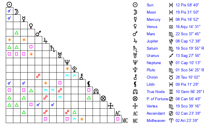 Sun | 12 Pisces 58 | 13 Pisces 2 | 23 Aries 37 |