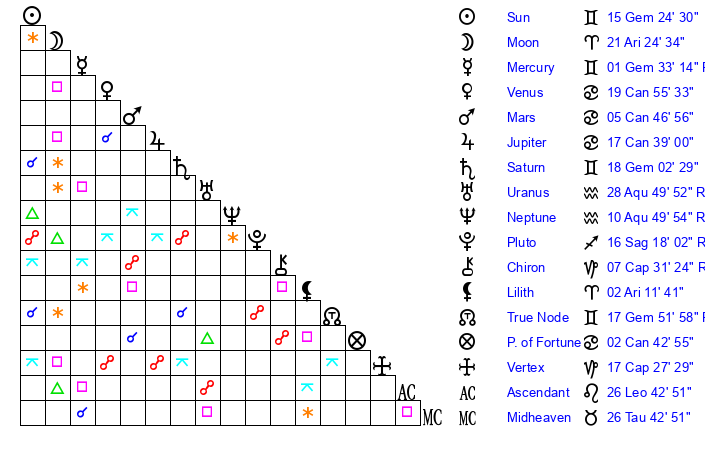 Saturn | 17 Gemini 56 | 0 Aries 43 | 20 Gemini 55 |
