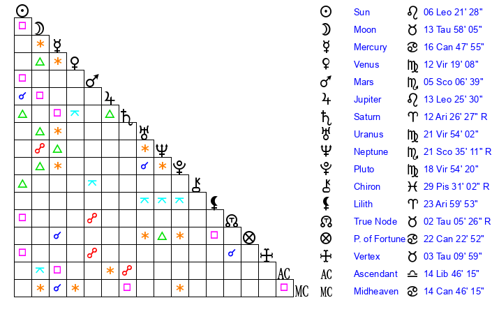 | Moon | 13 Taurus 53 | 11 Libra 54 | 24 Gemini 20 |