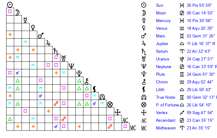 | Moon | 0 Cancer 18 | 12 Scorpio 54 | 15 Virgo 14 |