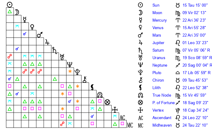 Sun | 15 Taurus 15 | 16 Taurus 6 | 29 Gemini 24 |