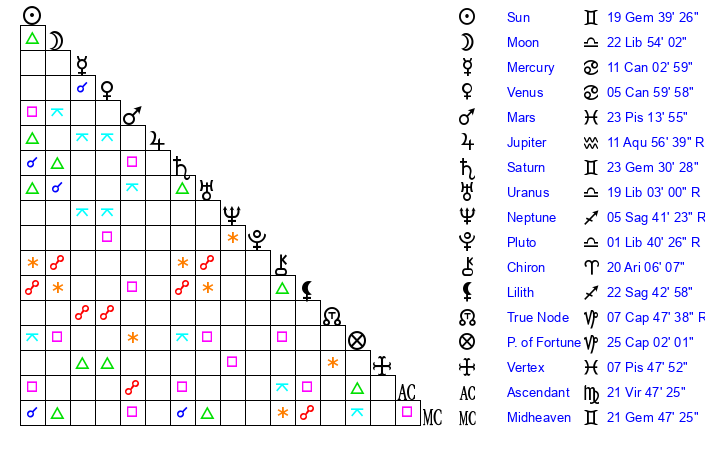 Moon | 22 Libra 56 | 13 Sagittarius 11 | 18 Virgo 34 |