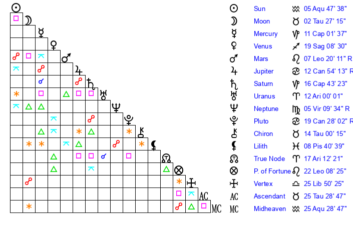 | Sun | 5 Aquarius 47 | 7 Aquarius 0 | 9 Taurus 23 |