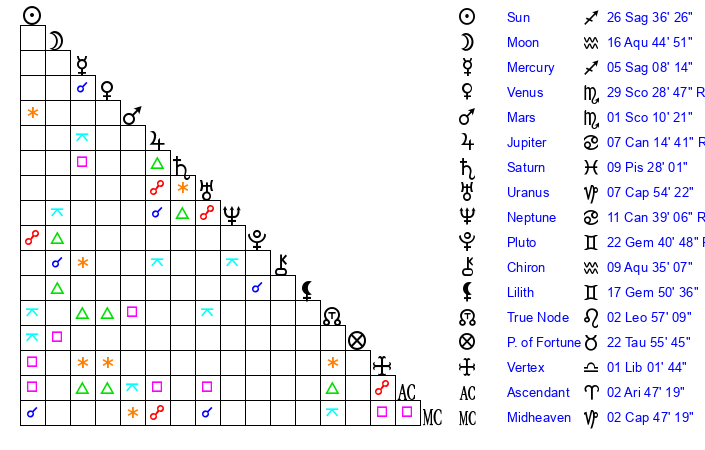 Moon | 16 Aquarius 38 | 18 Leo 39 | 6 Gemini 49 |