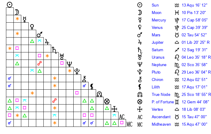 | Sun | 13 Aquarius 16 | 13 Aquarius 46 | 21 Aries 12 |