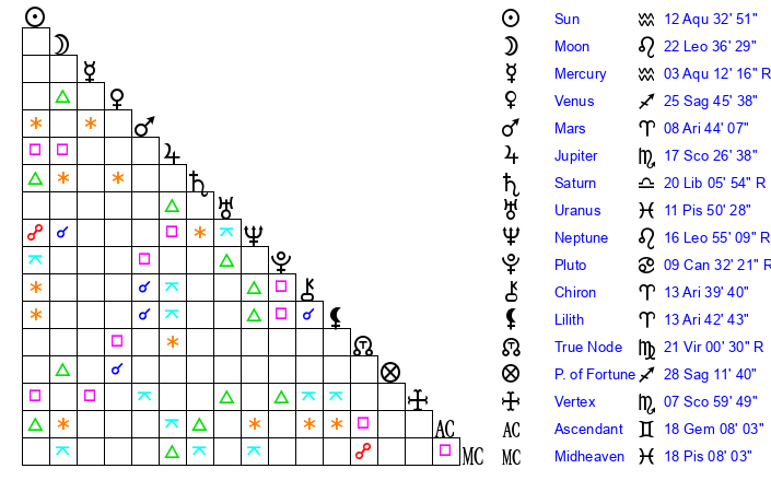 | Mercury | 3 Aquarius 11 | 8 Aquarius 45 | 10 Gemini 42 |