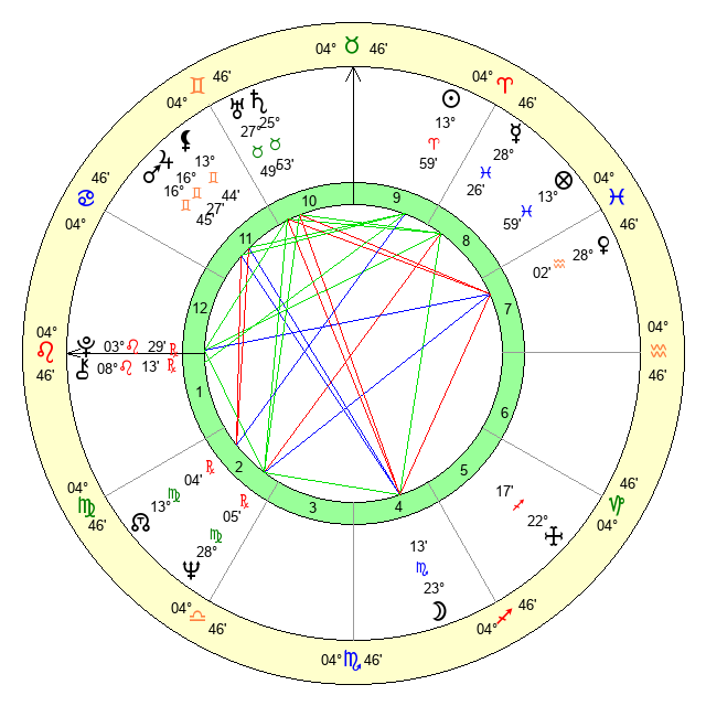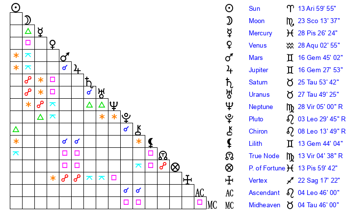 | Moon | 23 Scorpio 11 | 6 Cancer 28 | 4 Sagittarius 19 |