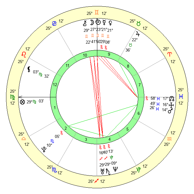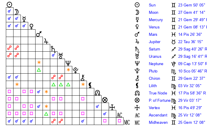 Moon | 27 Gemini 34 | 3 Aquarius 15 | 24 Libra 39 |