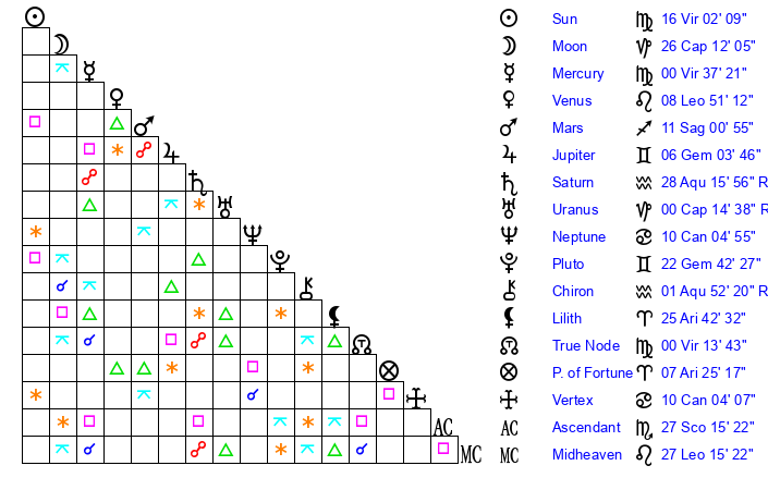 | Sun | 16 Virgo 2 | 16 Virgo 59 | 16 Capricorn 13 |
