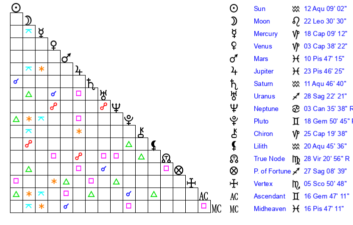 | Sun | 12 Aquarius 9 | 13 Aquarius 48 | 11 Gemini 24 |