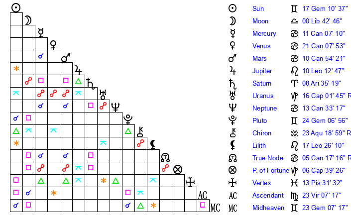 | Neptune | 13 Cancer 34 | 1 Aries 59 | 17 Cancer 2 |