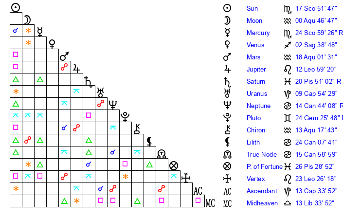 | Sun | 17 Scorpio 52 | 19 Scorpio 16 | 17 Pisces 27 |