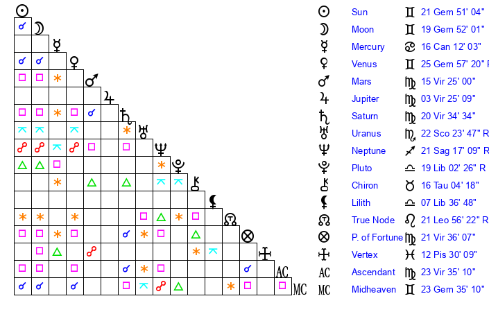 | Sun | 21 Gemini 51 | 21 Gemini 58 | 4 Leo 47 |