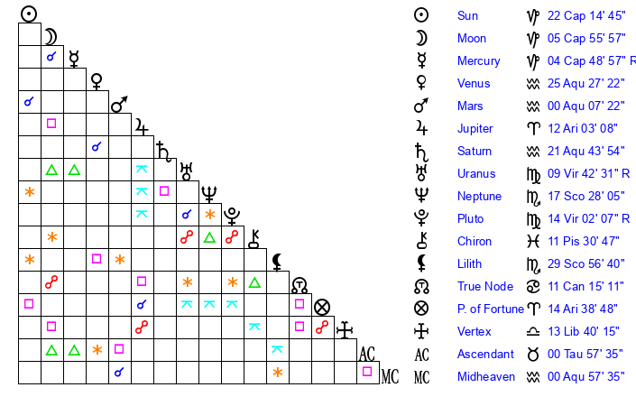 Pluto | 14 Virgo 2 | 1 Aquarius 27 | 12 Virgo 39 |