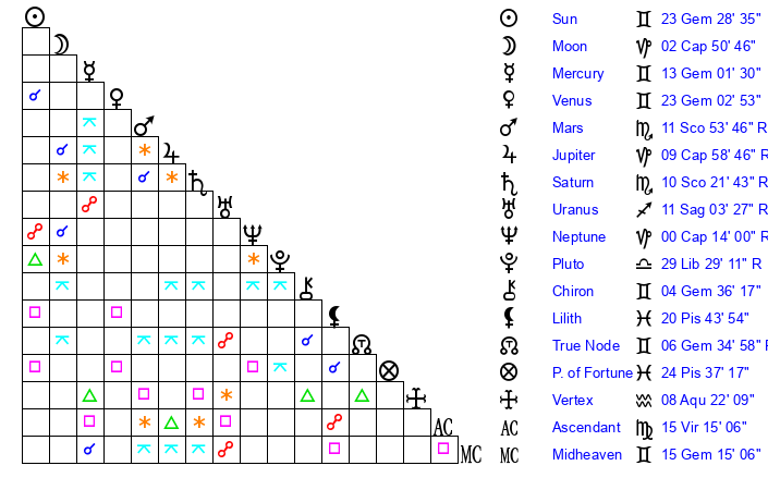 Pluto | 29 Libra 28 | 3 Aquarius 27 | 29 Libra 23 |