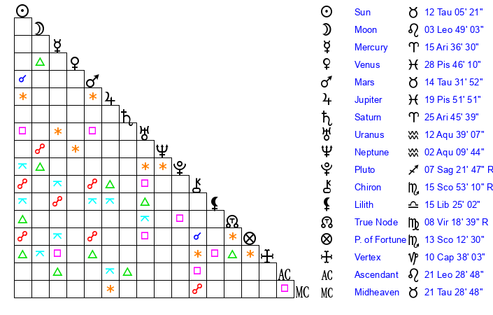 | Sun | 12 Taurus 5 | 12 Taurus 32 | 8 Gemini 7 |