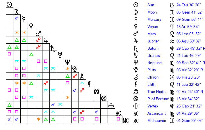 | Venus | 15 Aries 59 | 10 Aries 24 | 12 Gemini 19 |