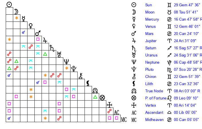 Venus | 12 Gemini 46 | 15 Taurus 59 | 29 Cancer 17 |